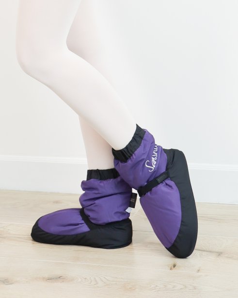 บู๊ตวอร์มอัพโทนสี Purple/Black ดีไซน์เท่และมั่นใจ ช่วยเก็บความอุ่นให้เท้าและข้อเท้า วัสดุน้ำหนักเบา นุ่มสบาย ใส่ทับรองเท้าบัลเล่ต์, Pointe, Jazz หรือ Contemporary ได้พอดี เหมาะทั้งก่อนซ้อม ระหว่างพัก หรือรอขึ้นเวที