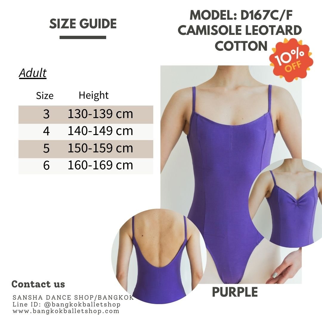 Brand : Sansha Model : D167C/F Color : Purple Name : Alessandra Material : 92% Cotton, 8% Elastane Size : 3 4 5 6 Detail : Full front lining, Adjustable gather front